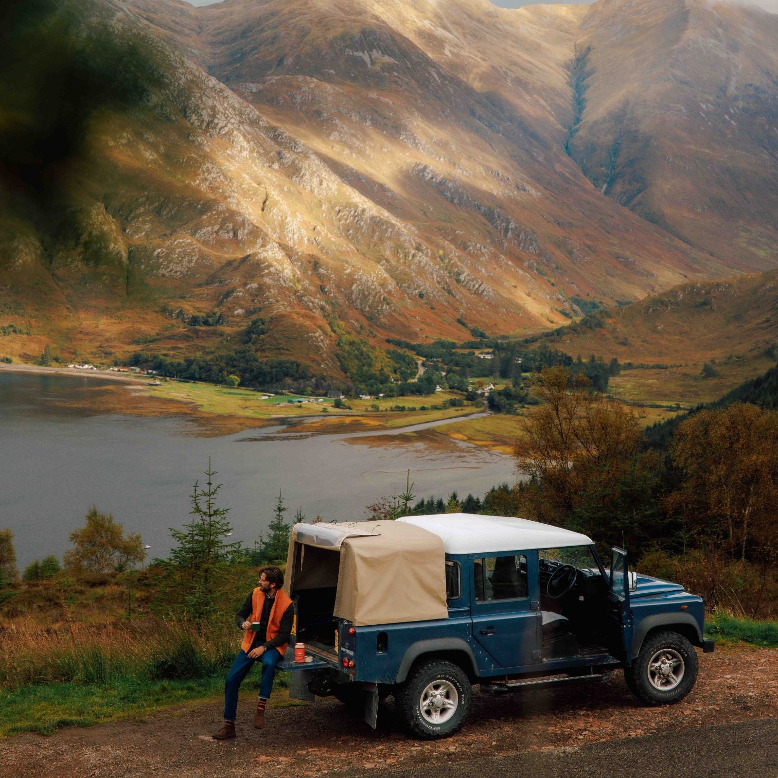 A person in Campbells of Beauly fishing gear stands beside a blue and white classic SUV with fishing rods attached to the roof, preparing for a fishing trip.